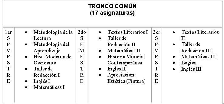 El Tronco Común abarca los tres primeros semestres y está constituido por 17 asignaturas de cultura general en las que se incluyen los cuatro campos de conocimiento como son el Matemático, el Histórico-Social, las Ciencias Naturales, Lenguaje y Comunicación; así como la Metodología del Aprendizaje y la Lectura.
